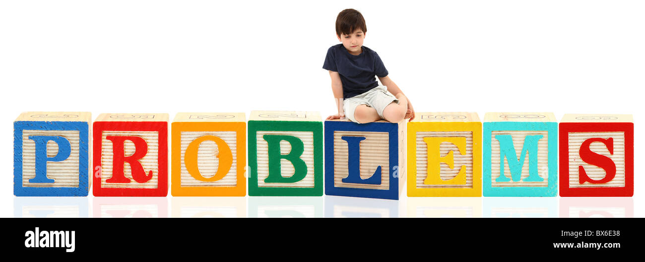 Colorful Alphabet Blocks Spelling The Word Problems With Seven Year Old Boy Sitting On Top Stock Photo Alamy